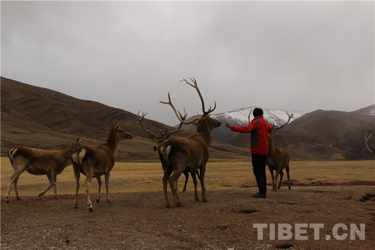 圖為哥哥白瑪澤旺呼喚鹿群過來覓食