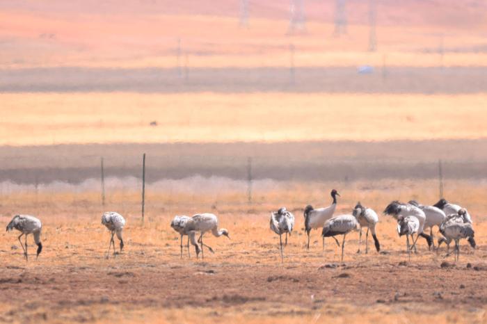 4月24日,在青海湖北岸的青海省海北藏族自治州剛察縣,攝影愛(ài)好者在該縣哈爾蓋鎮(zhèn)田間拍攝到成群黑頸鶴。黑頸鶴是全球十五種鶴類中唯一在高原繁殖和棲息的鶴類。[詳細(xì)]