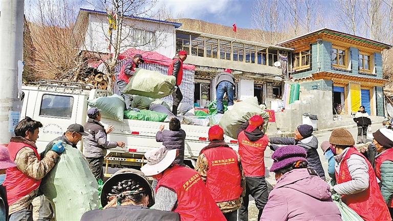圖為朗縣登木鄉(xiāng)新時(shí)代文明實(shí)踐志愿者將清理出來(lái)的垃圾裝車(chē)。記者 史金茹 攝