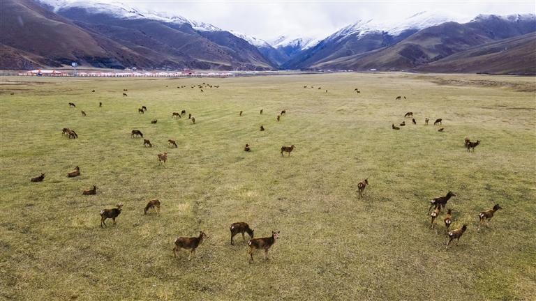 5月21日在類(lèi)烏齊馬鹿國(guó)家級(jí)自然保護(hù)區(qū)拍攝的馬鹿(無(wú)人機(jī)照片)。新華社記者 周荻瀟 攝