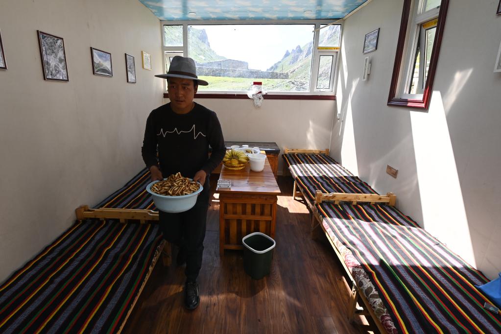 盛夏,昂賽大峽谷流水潺潺、綠草如茵;四周山勢奇絕,常有雪豹、白唇鹿、巖羊等野生動(dòng)物出沒。在特許經(jīng)營接待集裝箱內(nèi),桑周忙著打掃衛(wèi)生,清洗床鋪,準(zhǔn)備迎接從各地到來的自然體驗(yàn)者。