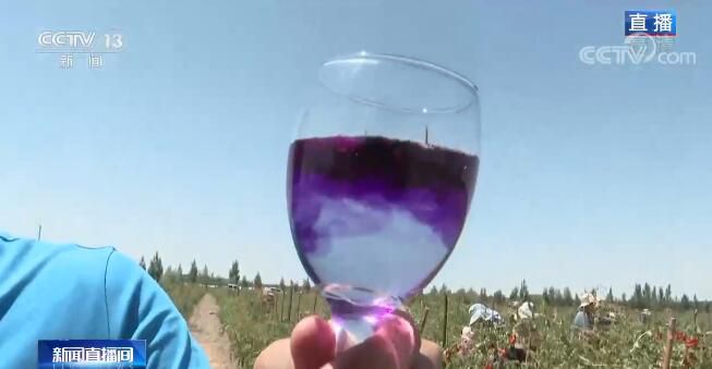 除了紅枸杞之外,這里還種植了15000多畝的有機(jī)黑枸杞,黑枸杞的成熟時(shí)間要遲一些,在8月下旬,所以我現(xiàn)在手里只有黑枸杞干。大家可以看一看,如果我們把它也像紅枸杞一樣泡入水中的話,顏色展開(kāi)得非常快,幾秒鐘的時(shí)間水就已經(jīng)是藍(lán)紫色了。當(dāng)?shù)氐呢?fù)責(zé)人告訴我,這很大程度是因?yàn)樗幕ㄇ嗨睾扛?,所以黑枸杞也有另外一個(gè)名字,叫作“花青素之王”。