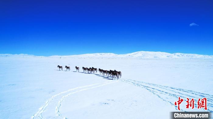 圖為黃河源頭瑪多出現(xiàn)積雪,藏野驢群在雪地里行走。 祁緒龍 攝