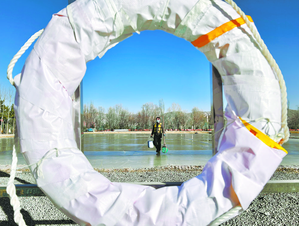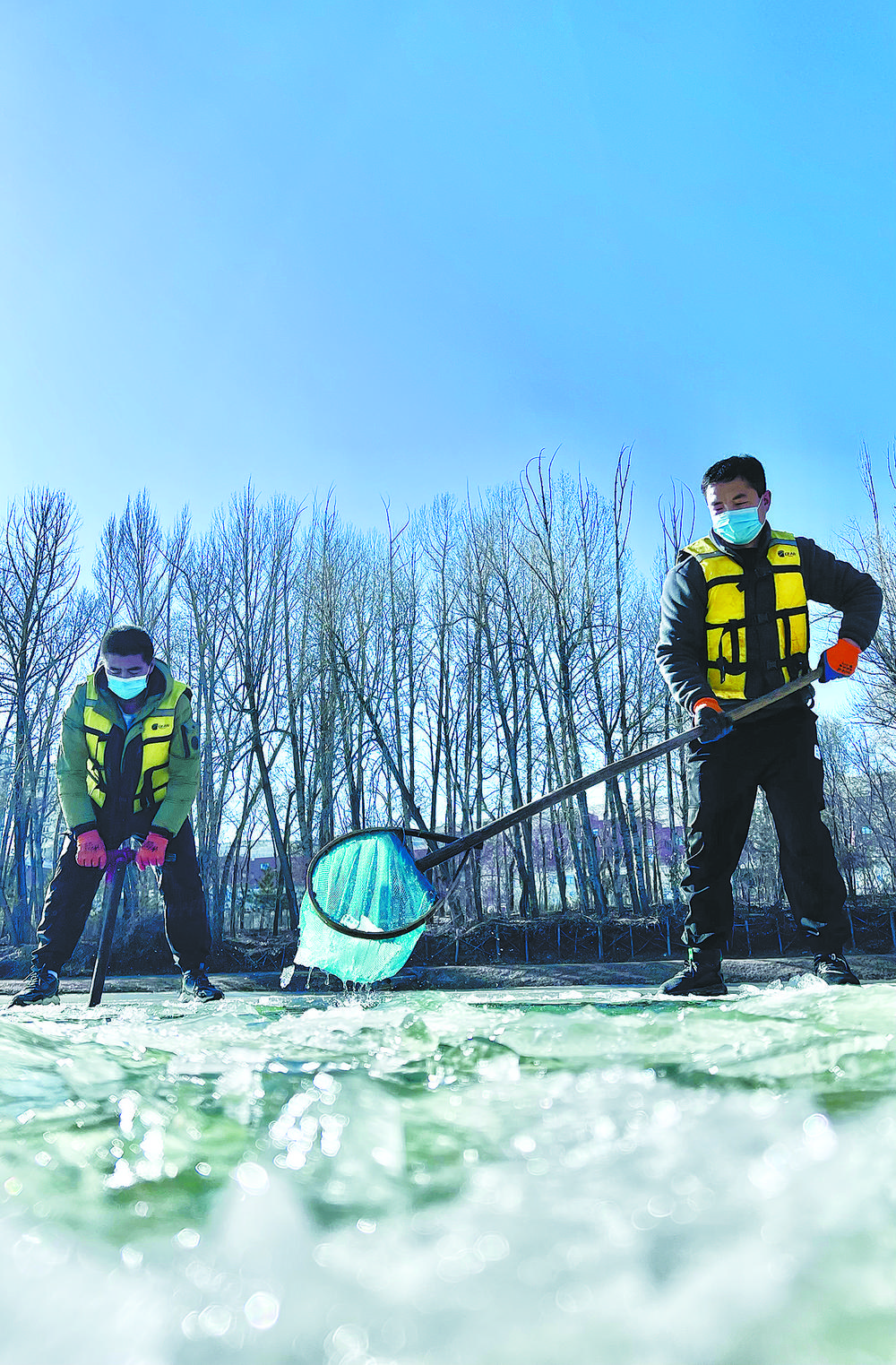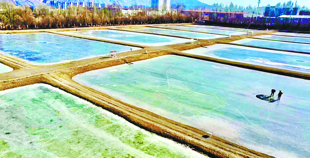 陽(yáng)光透過冰面照射在18口冰封的魚塘里,為過冬的小魚苗增氧增溫。這片池塘是裸鯉來(lái)到裸鯉救護(hù)中心的第一站,田文根是這里的一名工作人員,主要負(fù)責(zé)室外原種場(chǎng)魚苗的培育和水質(zhì)監(jiān)測(cè)工作。據(jù)他介紹,魚塘的水質(zhì)決定著魚苗的健康狀況。在冬季,及時(shí)掃雪是一項(xiàng)非常重要的工作,因?yàn)楸鶎酉旅娴穆沲庺~苗是靠浮游植物通過光合作用產(chǎn)生的氧氣生存,如果雪附著在冰層上,陽(yáng)光無(wú)法透進(jìn),就容易造成缺氧。