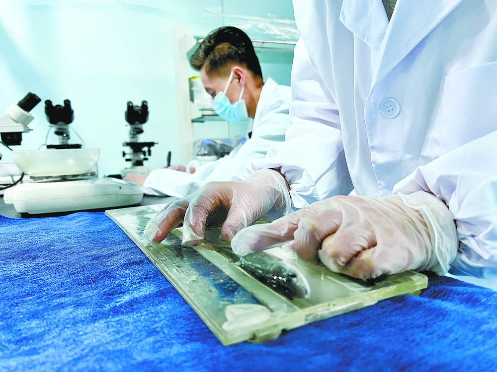 技術(shù)人員正在測(cè)量魚體的身長(zhǎng)。