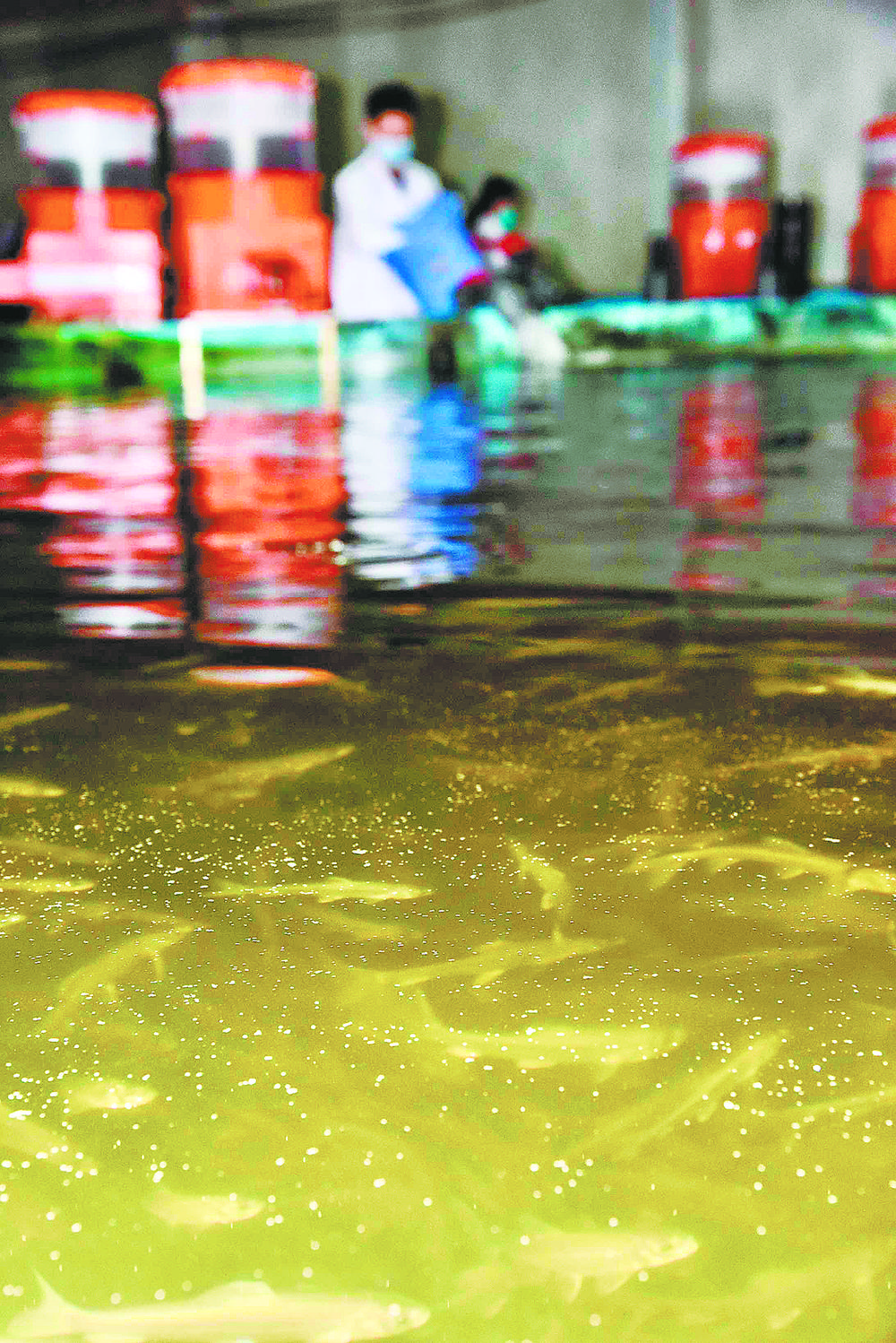 技術(shù)人員對(duì)循環(huán)水養(yǎng)殖池育苗投喂。