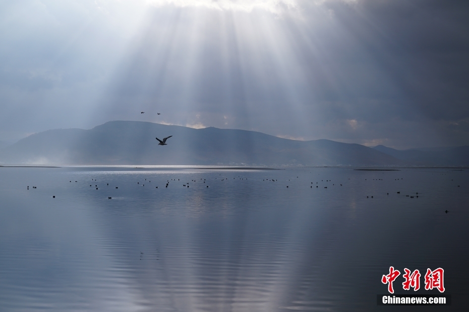 2月21日,候鳥在納帕海覓食嬉水。中新社記者 劉冉陽 攝