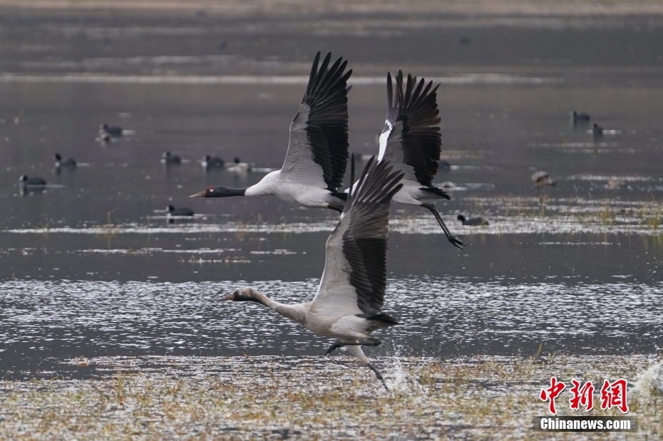 2月21日,黑頸鶴在納帕海展翅起飛。中新社記者 劉冉陽 攝