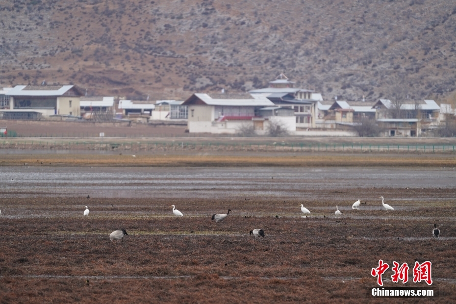 2月21日,覓食的候鳥與納帕海遠(yuǎn)處的村莊相映成趣。中新社記者 劉冉陽 攝