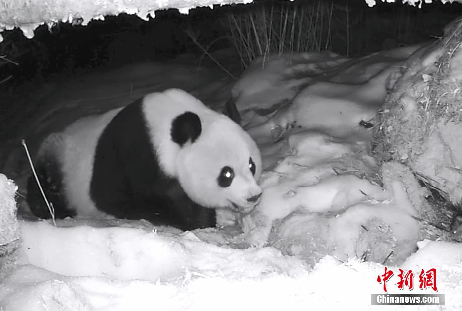 近日,大熊貓國家公園四川平武王朗片區(qū)工作人員在回收野外紅外線相機(jī)時(shí),發(fā)現(xiàn)幾段野生大熊貓?jiān)谘┑刂姓宜鹊恼滟F影像。圖為野生大熊貓?jiān)谘┑刂姓宜取?/p>