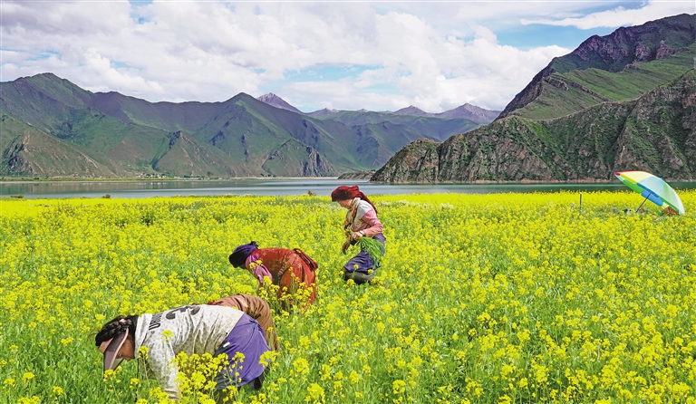 圖為墨竹工卡縣尼瑪江熱鄉(xiāng)幫達村村民在油菜花田里拔雜草。記者 唐斌 通訊員 洛克 攝