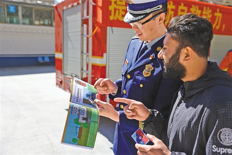 活動(dòng)向入境外籍游客和商人發(fā)放了中文、英文、藏文三種語(yǔ)言的消防宣傳資料,用英語(yǔ)向外籍游客和商人講解、演示滅火器材使用方法、常見(jiàn)火災(zāi)預(yù)防措施、火場(chǎng)逃生和急救常識(shí)等,并組織干粉滅火器實(shí)操、液化石油氣火災(zāi)處置和疏散逃生演練。