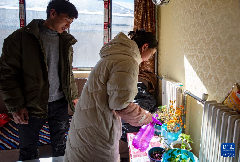 距離太陽能集熱場約3公里外的縣職工周轉(zhuǎn)房小區(qū)是供暖工程的最遠端,年輕夫妻曲珠(左)和央次仁在家中侍弄花草(1月6日攝)。新華社記者 姜帆 攝