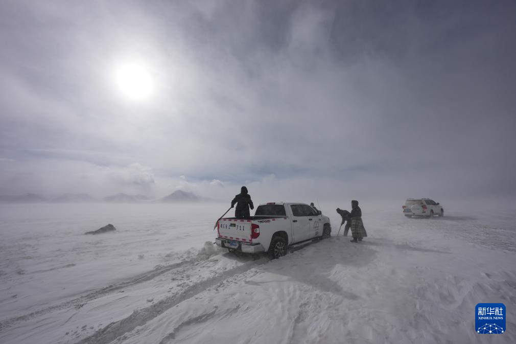 瑪曲鄉(xiāng)長(zhǎng)江源黨員環(huán)保志愿隊(duì)巡邏途中車輛陷入雪中后進(jìn)行自救(2024年2月2日攝)。新華社記者 晉美多吉 攝