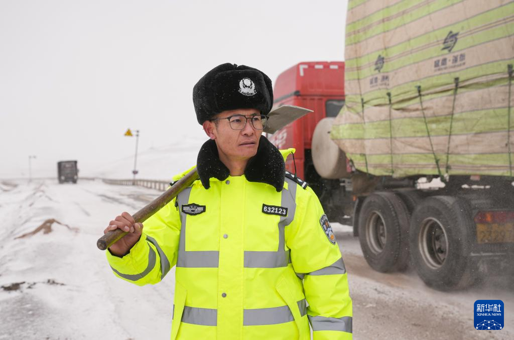 安多交警大隊(duì)秩序中隊(duì)隊(duì)長(zhǎng)達(dá)娃云旦在冰雪路段緊盯過往車輛(2024年2月1日攝)。新華社記者 晉美多吉 攝