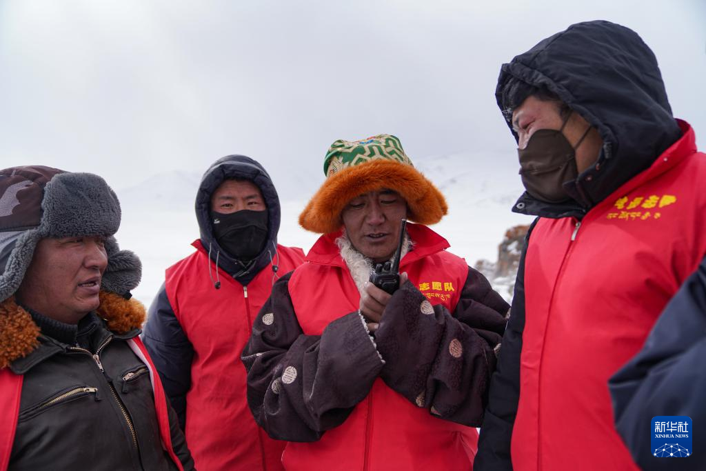 瑪曲鄉(xiāng)長(zhǎng)江源黨員環(huán)保志愿隊(duì)隊(duì)員在巡邏時(shí)通過對(duì)講機(jī)互相聯(lián)系(2024年2月2日攝)。新華社記者 晉美多吉 攝