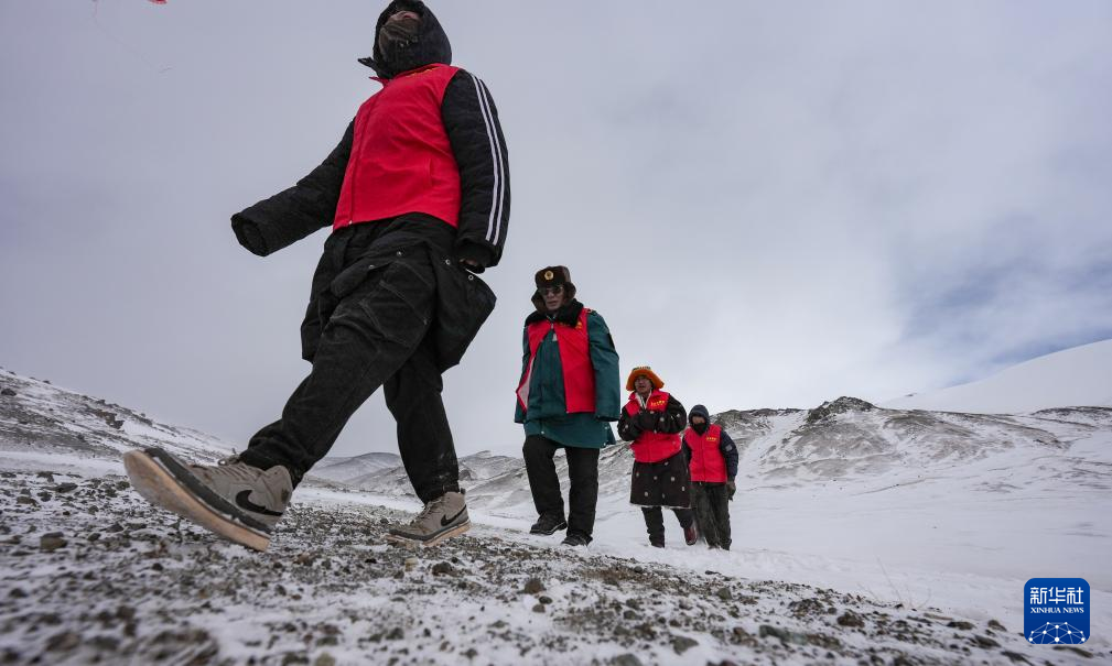 瑪曲鄉(xiāng)長(zhǎng)江源黨員環(huán)保志愿隊(duì)年近七旬的才嘎老人(右二)在巡邏守護(hù)長(zhǎng)江源(2024年2月2日攝)。新華社記者 晉美多吉 攝