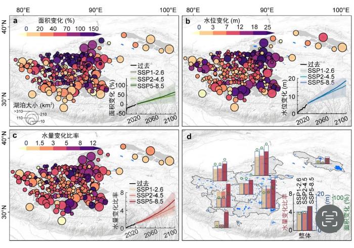 至21世紀末,中等排放情景下湖泊面積、水位和水量變化。中國科學院青藏高原研究所/供圖