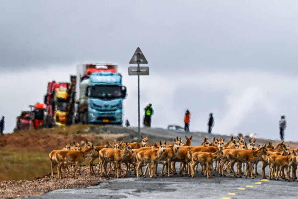 2024年5月27日,藏羚羊在青海省可可西里五道梁地區(qū)通過(guò)青藏公路。新華社記者 張龍 攝