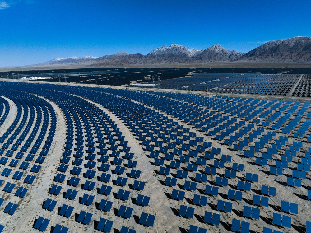 345平方公里的發(fā)電園內(nèi),超過(guò)1000萬(wàn)塊光伏板高低起伏連成蔚藍(lán)色的“海洋”,年發(fā)電量超過(guò)200億千瓦時(shí),相當(dāng)于減排二氧化碳超過(guò)2122萬(wàn)噸。