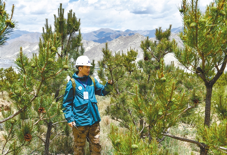 拉薩南北山綠化工程2024年度鞏固提升(貢嘎機(jī)場周邊山體)工程項目上,第三方監(jiān)理人員在檢查樹木狀況。新華社記者 晉美多吉 攝
