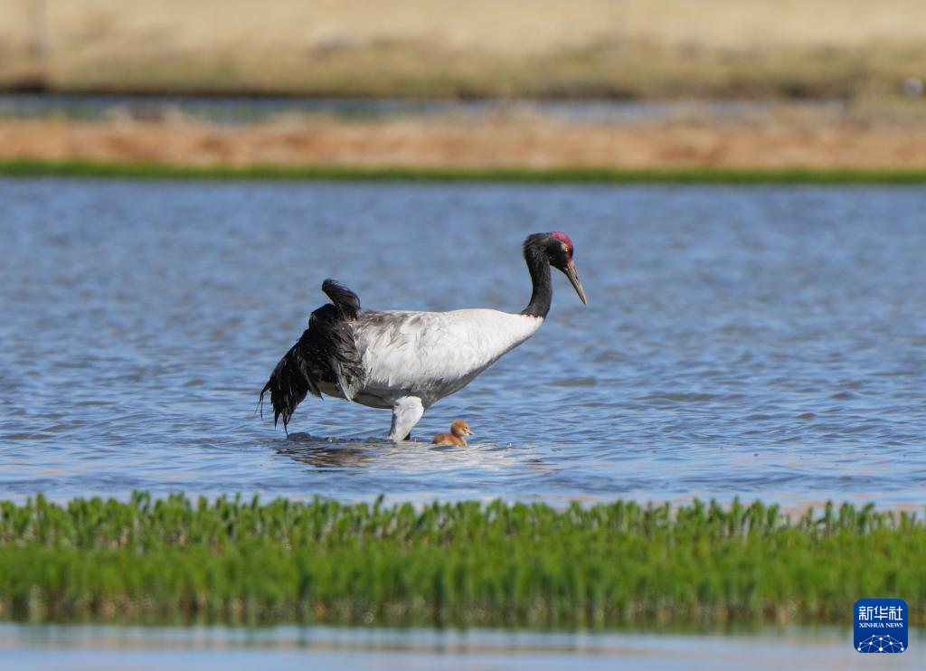 6月9日,黑頸鶴帶著雛鳥在西藏那曲市申扎縣一處濕地棲息、覓食。新華社記者 晉美多吉 攝