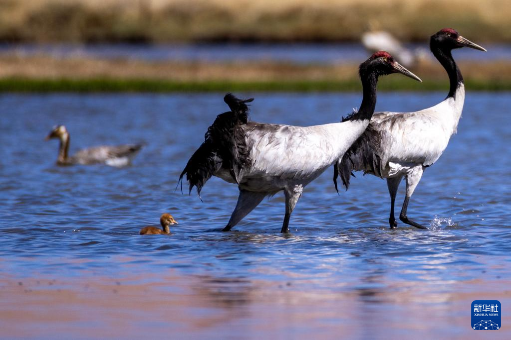 6月9日,一對黑頸鶴夫婦帶著雛鳥在西藏那曲市申扎縣一處濕地棲息、覓食。新華社記者 晉美多吉 攝
