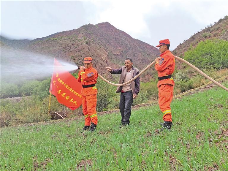 圖為消防員與俄洛鎮(zhèn)村民查看田地灌溉情況。