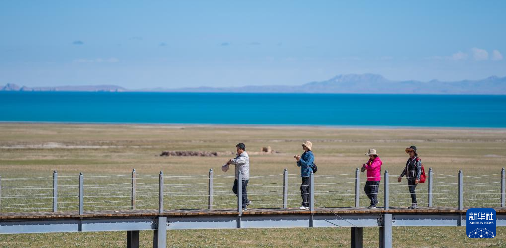 6月22日,游客在色林錯湖畔的觀景棧道上漫步。新華社記者 丁增尼達 攝