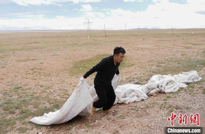 圖為可可西里管理處五道梁保護(hù)站生態(tài)管護(hù)員德尕在青藏公路沿線收集垃圾。馬銘言攝
