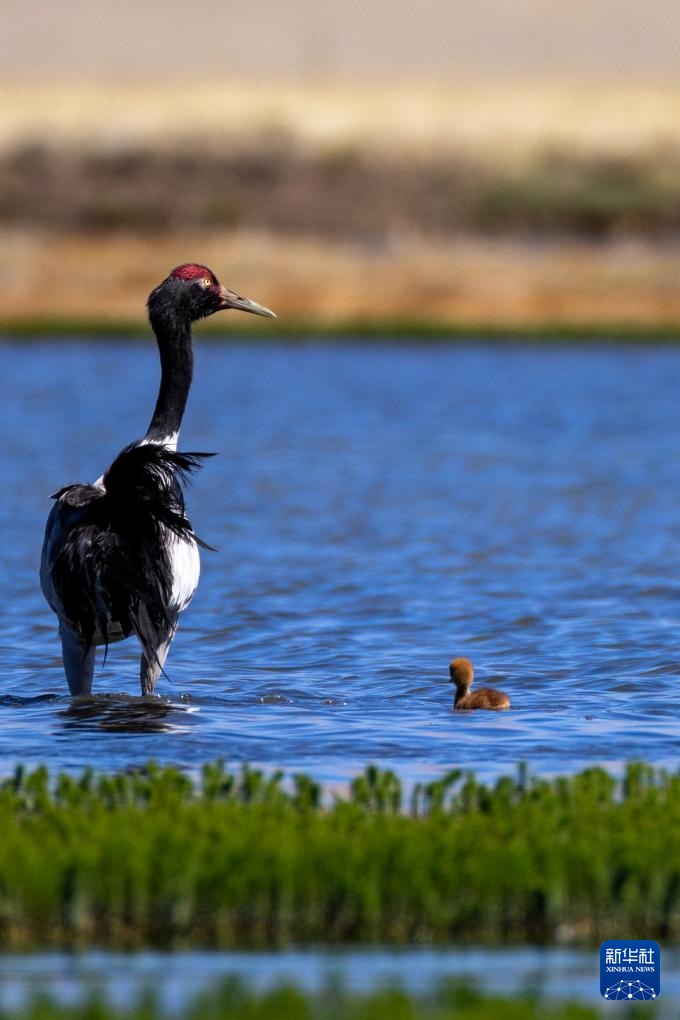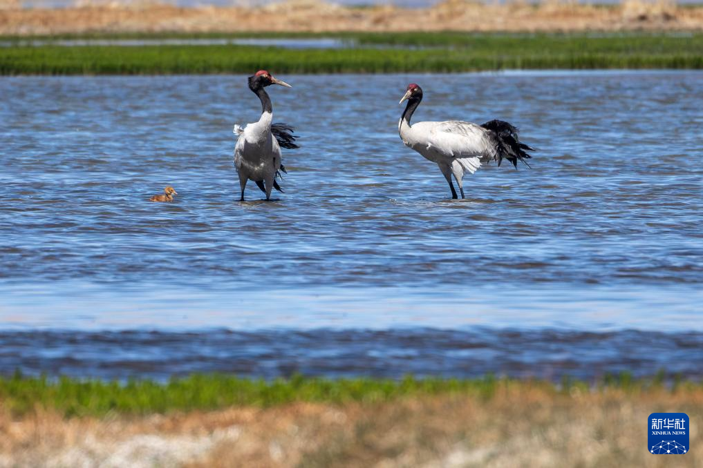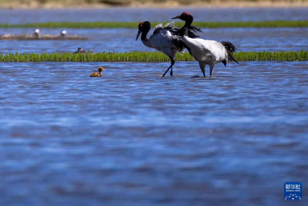 這是在那曲市申扎縣拍攝的養(yǎng)育雛鳥的黑頸鶴(6月9日攝)。新華社記者 旦增尼瑪曲珠 攝