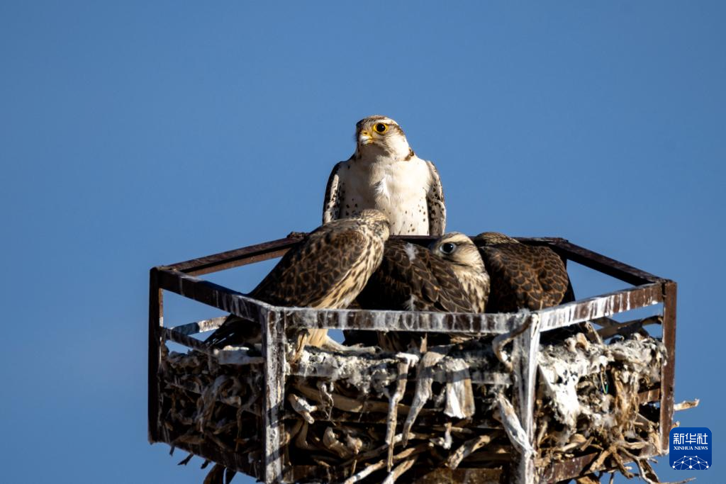 這是在那曲市尼瑪縣拍攝的養(yǎng)育雛鳥的游隼,它們?cè)凇盁o(wú)人區(qū)”中林草部門樹立的“鷹架”上營(yíng)巢(6月13日攝)。新華社記者 姜帆 攝