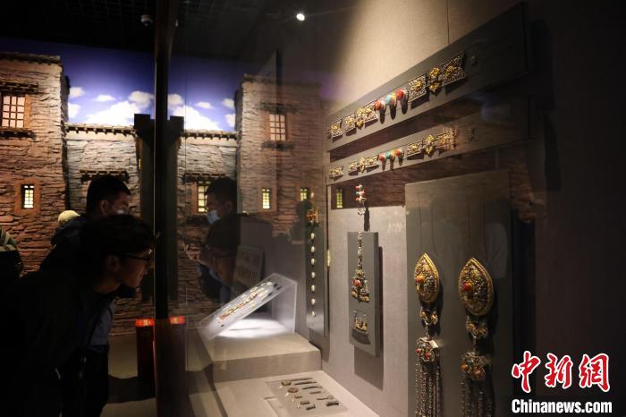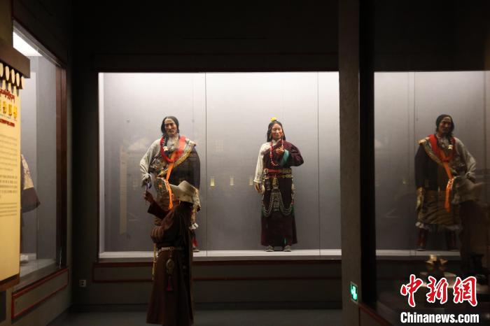 7月24日,參加“中國(guó)式現(xiàn)代化的萬(wàn)千氣象·網(wǎng)絡(luò)名人青海行”活動(dòng)的網(wǎng)絡(luò)名人,抵達(dá)江河源頭青海玉樹(shù)藏族自治州,在玉樹(shù)州博物館一覽自然與人文之美。玉樹(shù)州博物館是玉樹(shù)地震災(zāi)后重建十大標(biāo)志性建筑之一,分為序廳、自然展區(qū)、人文展區(qū)、臨時(shí)展廳。其通過(guò)實(shí)物標(biāo)本等方式,展示了三江源和可可西里的野生動(dòng)物、草地、森林,以及玉樹(shù)州的歷史、建筑、服飾、飲食等。圖為玉樹(shù)州博物館內(nèi)的服飾文化展示。中新社記者 張?zhí)砀?攝