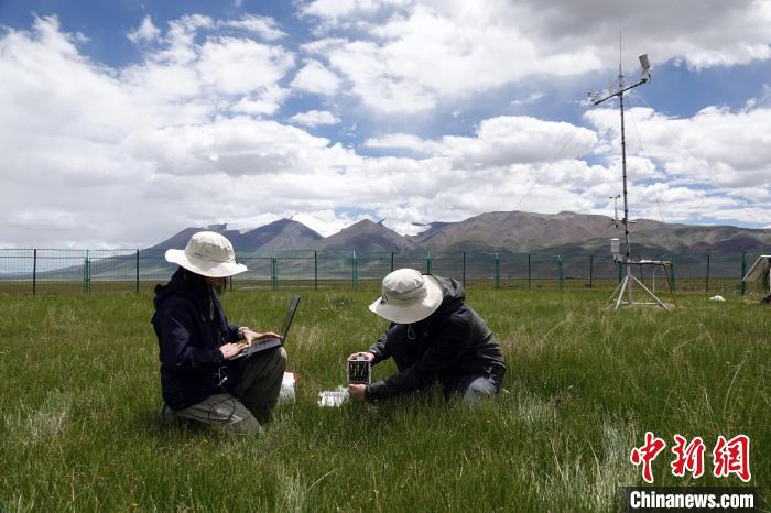 中國科學(xué)院申扎高寒草原與濕地生態(tài)系統(tǒng)觀測試驗(yàn)站(申扎站)高寒濕地觀測試驗(yàn)場,科研人員采集相關(guān)觀測數(shù)據(jù)。中新網(wǎng)記者孫自法攝