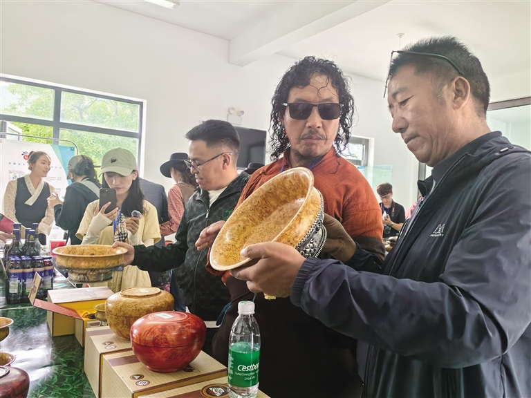 探訪團一行前往西藏山南加查達布傳統(tǒng)文化產(chǎn)業(yè)發(fā)展有限公司探訪加查木碗的制作技藝。在該公司的展廳內(nèi),西藏自治區(qū)級加查木碗非遺傳承人、公司負(fù)責(zé)人桑珠向探訪團詳細(xì)講解了加查木碗從選材、切割、打磨到雕刻的每一個制作環(huán)節(jié)。桑珠拿起一個個造型各異、原材料不同的木碗向探訪團介紹著木碗的品質(zhì)分辨技巧、用處等。楊樹、松樹、柏樹……一塊塊承載著歲月的木頭,經(jīng)過木匠們的一道道復(fù)雜的工序后,變成了精美的藝術(shù)品?!斑@種碗面像圓珠筆點涂的是上等木料制成的精品,最低售賣價值可達到4000元一個?!鄙V檎f,“現(xiàn)在來買木碗的人越來越多,很多游客也會買回去當(dāng)伴手禮。這讓我更加堅定了傳承和發(fā)展這項技藝的決心?!?/p>