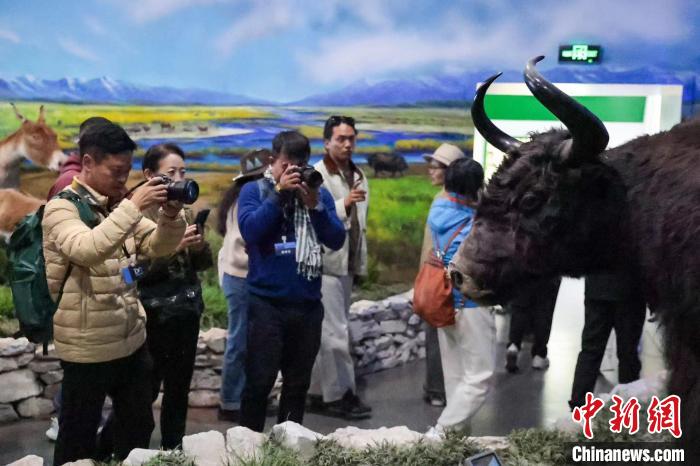 圖為此次活動受邀嘉賓在玉樹州博物館內(nèi)拍攝牦牛標本。薛蒂 攝