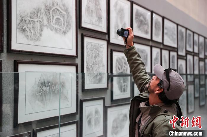 圖為受邀參加活動的外國攝影師在玉樹州博物館內(nèi)拍攝巖畫。薛蒂 攝