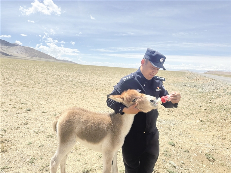 民警給被救小野驢喂奶。圖由阿里地區(qū)公安處提供