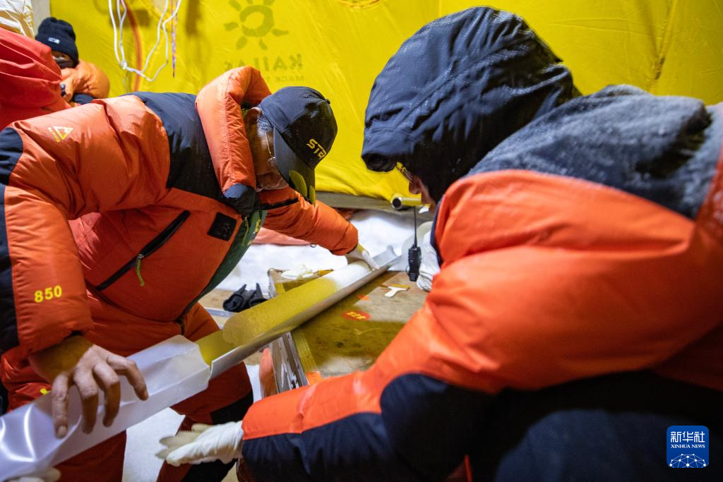 徐柏青(右二)和同事從鉆頭中取出鉆取的冰芯(9月11日攝)。新華社記者 姜帆 攝
