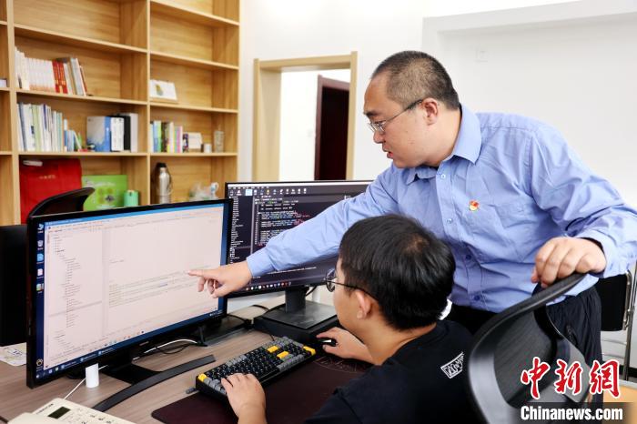 圖為蔡海寧(右)指導(dǎo)同事進(jìn)行編程。張?zhí)砀?攝