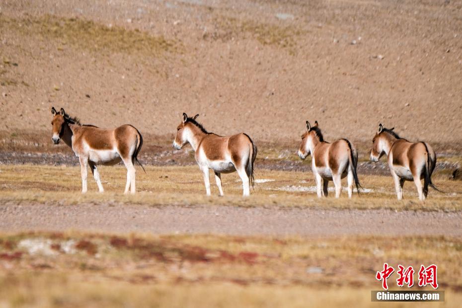 西藏羌塘草原位于昆侖山脈、唐古拉山脈和岡底斯山脈之間,是野生動植物的天堂。近日,中新社記者探訪西藏羌塘草原腹地那曲市雙湖縣,看到當?shù)夭亓缪颉⒉匾绑H、藏原羚等野生動物成群覓食,悠然自得。圖為10月3日,羌塘草原上的一群藏野驢悠閑覓食。