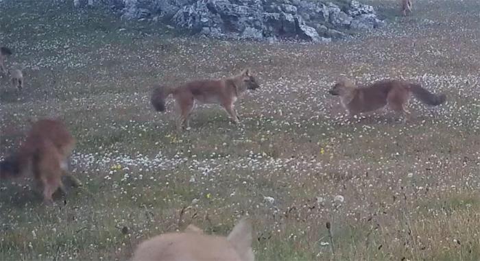 圖為祁連山管護中心2024年監(jiān)測到的豺種群出沒視頻截圖。祁連山管護中心野生動植物管理科供圖