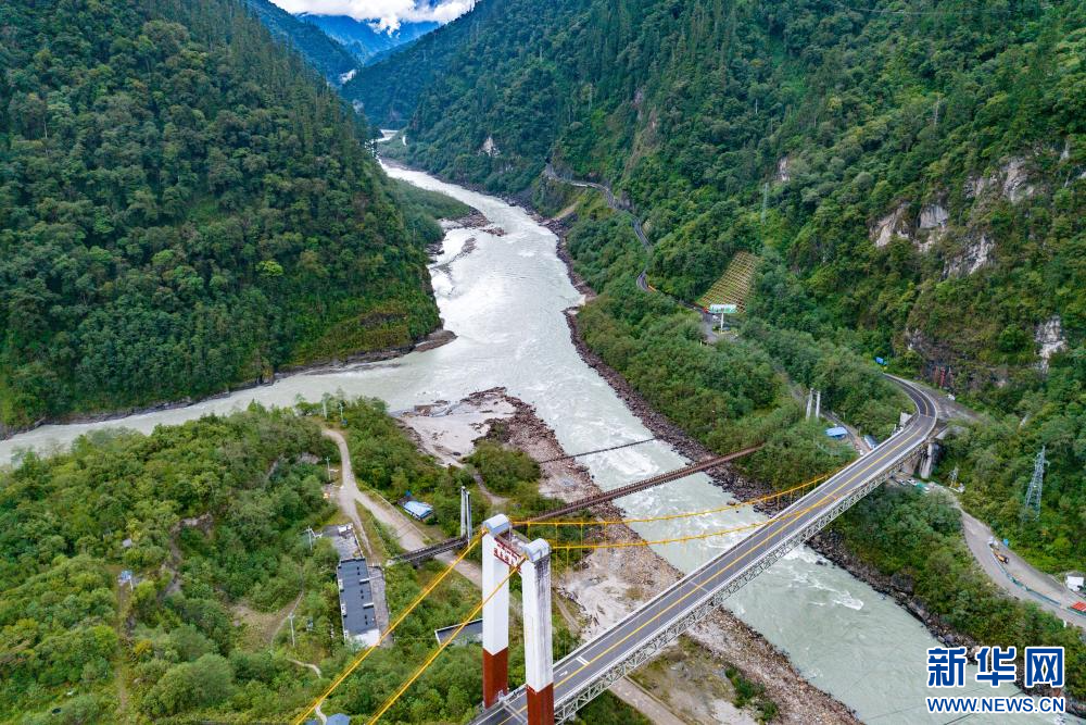 俯瞰通麥路段上的三座建于不同時(shí)期的橋(10月10日攝 無(wú)人機(jī)照片)。位于西藏林芝市波密縣境內(nèi)的川藏公路通麥路段,曾被稱為“通麥天險(xiǎn)”。新華網(wǎng) 旦增努布 攝