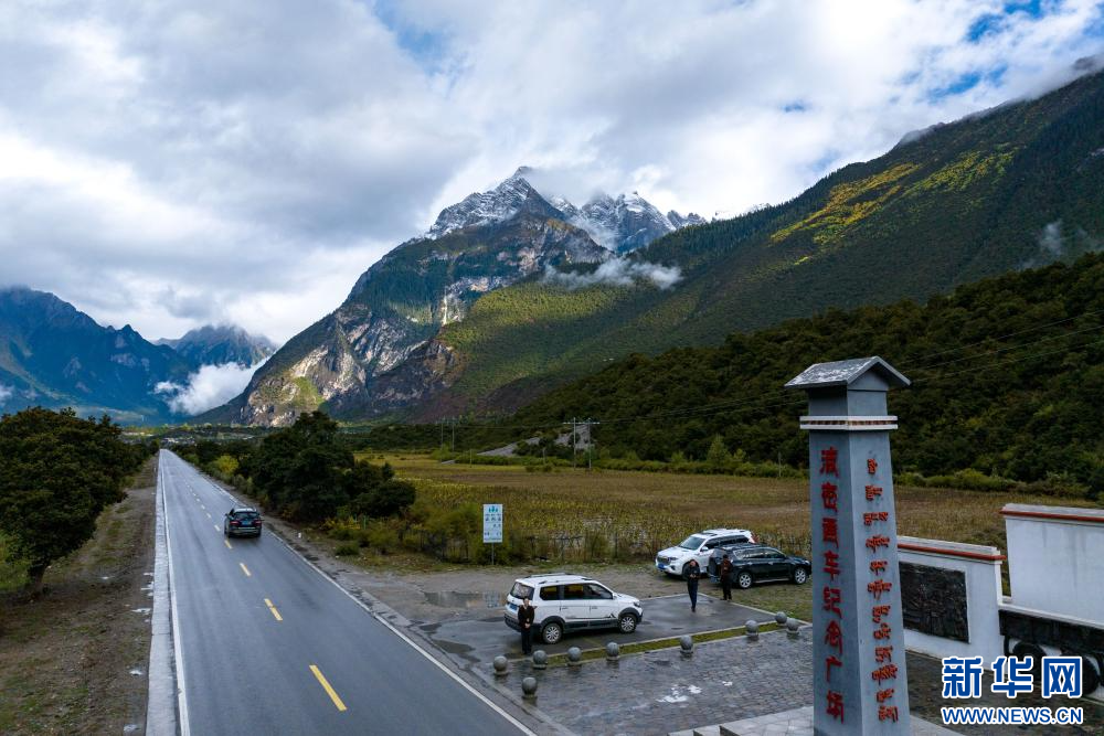 10月11日拍攝的波密通車(chē)紀(jì)念廣場(chǎng)(無(wú)人機(jī)照片)。2020年,西藏波密縣通過(guò)查閱文獻(xiàn)史料、比對(duì)老照片、咨詢當(dāng)?shù)乩先?、遠(yuǎn)程連線老一輩同志等方式,考證出當(dāng)時(shí)舉行通車(chē)典禮的地點(diǎn)為今波密縣松宗鎮(zhèn)角達(dá)村國(guó)道318旁。為紀(jì)念這一歷史事件,2021年4月波密縣在此處修建了波密通車(chē)紀(jì)念廣場(chǎng)。新華網(wǎng) 旦增努布 攝