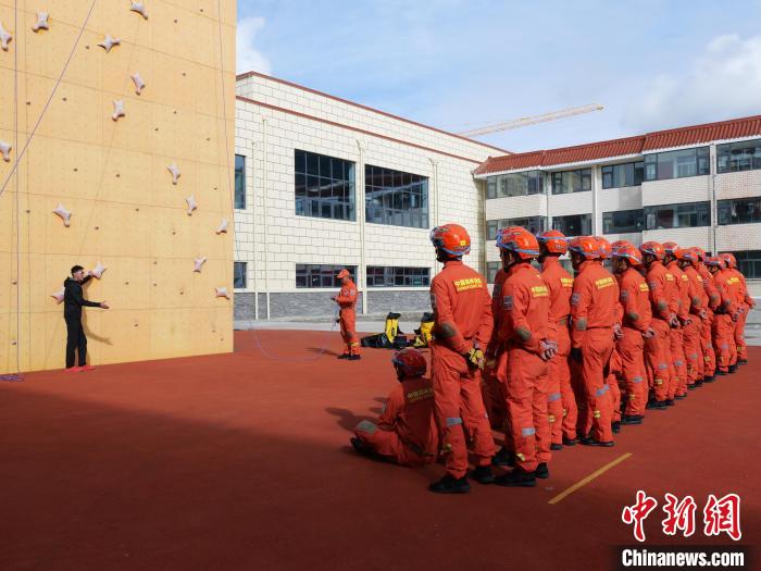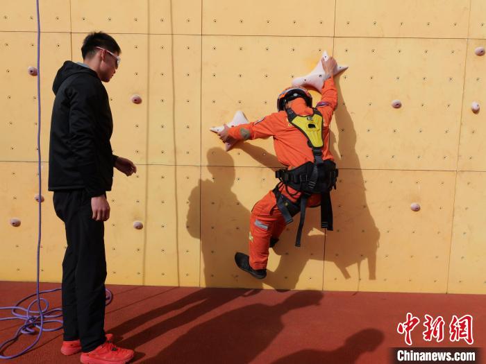 圖為訓練中,教員指導消防員攀巖技巧。扎西頓珠 攝