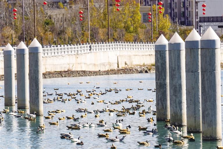 開闊的河面上,斑頭雁、黃鴨、赤麻鴨等鳥類往來(lái)于此,此起彼伏的叫聲不絕于耳。在陽(yáng)光的照射下水面波光粼粼,候鳥或嬉游、或覓食、或追逐,這一和諧優(yōu)美的景象,引得不少觀賞的市民和游客舉起手機(jī)或相機(jī)記錄。