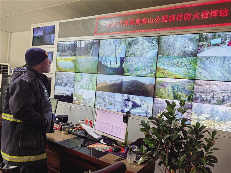 在南山公園,記者遇到了西藏森林消防總隊(duì)特勤大隊(duì)二中隊(duì)的工作人員格桑。今年1月,單位掛牌正式入駐南山公園,扎西曲培是他們的搭檔,經(jīng)常參與上山救人、防火宣傳等工作。