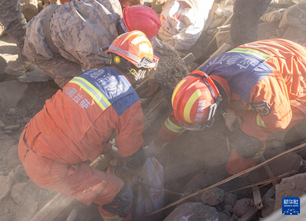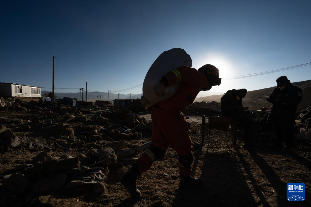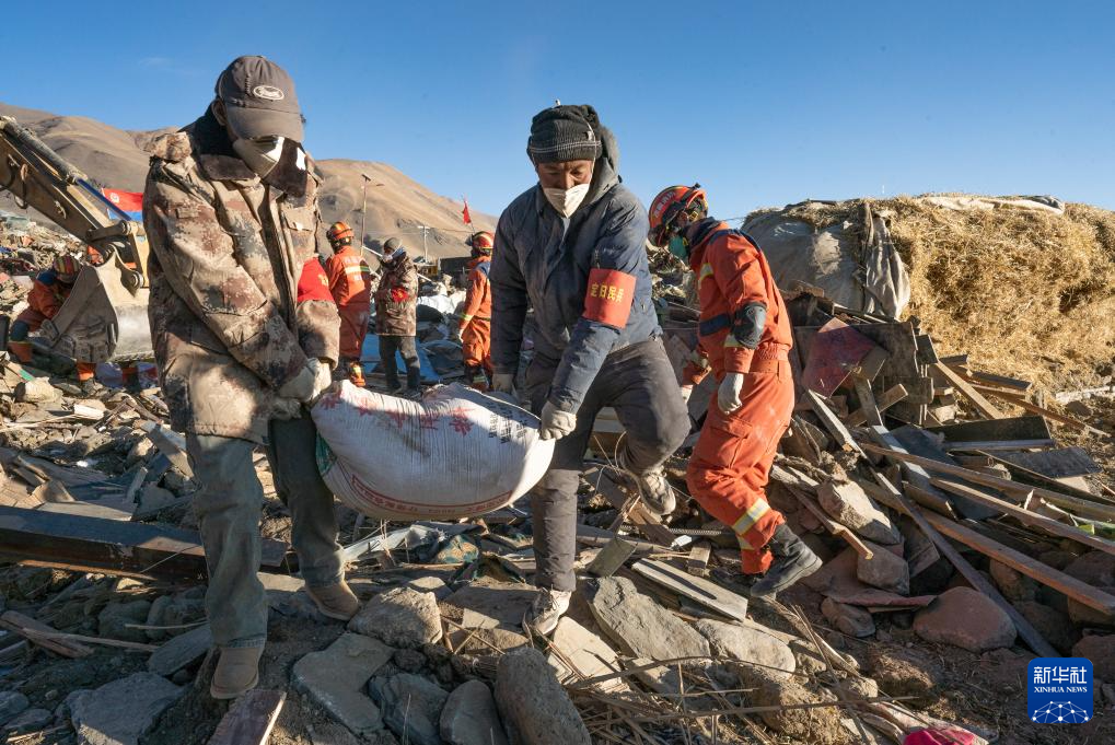 1月13日,在定日縣長(zhǎng)所鄉(xiāng)古榮村,消防員們?cè)诎徇\(yùn)從次仁扎西老人家里搶救出的青稞。新華社記者 丁增尼達(dá) 攝
