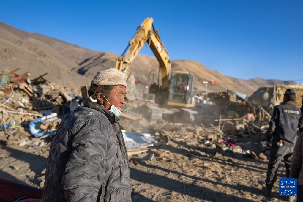 1月13日,在定日縣長(zhǎng)所鄉(xiāng)古榮村,邊巴桑珠(右一)在指揮房屋廢墟清理工作。新華社記者 丁增尼達(dá) 攝