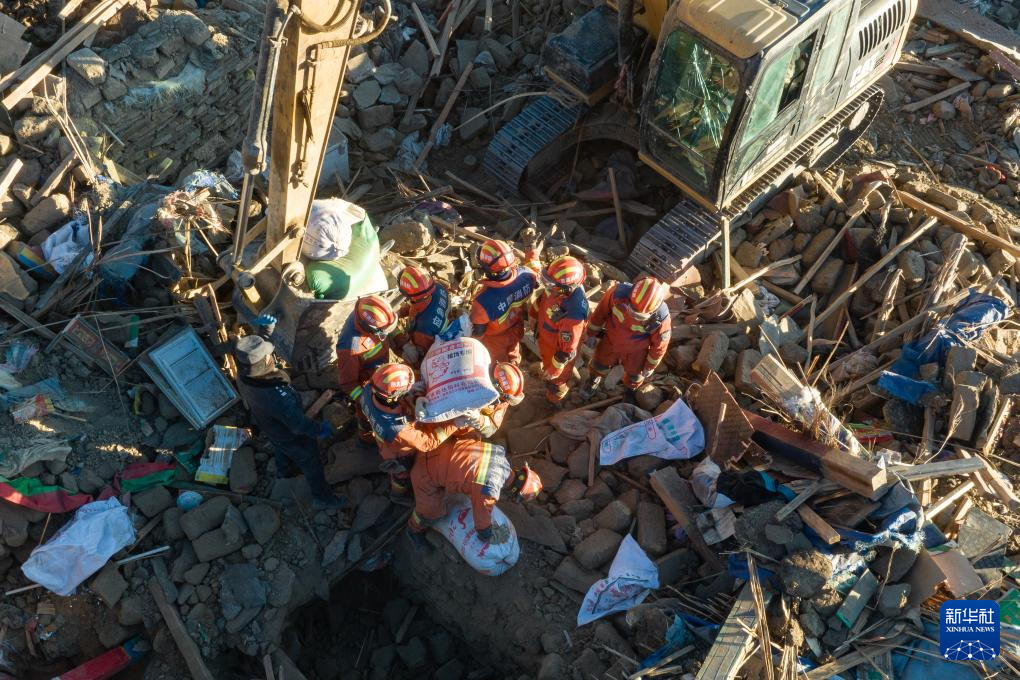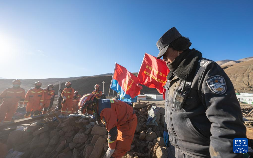 1月13日,在定日縣長(zhǎng)所鄉(xiāng)古榮村,消防員、武警官兵和公安干警在搜尋次仁扎西老人家里的青稞。新華社記者 丁增尼達(dá) 攝